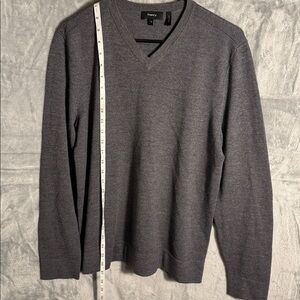 Elegant charcoal V-neck sweater. Ideal for versatile styling. This merino wool sweater is in good preowned condition. It does have a stain at the waist hemline and in picture.