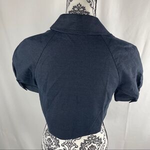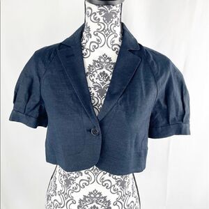 Theory Claude cropped jacket size 2. Linen/silk blend material (see tag for full makeup). Indigo blue with single button closure. Short puffed sleeves with button accents. Notched, foldover collar. No holes or stains. So cute!