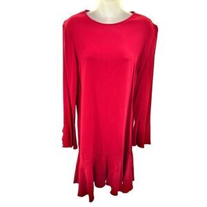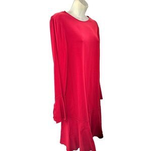 Theory red dress, Theory Marah Bergen, viscose blend dress, flounce hem dress, size 6 Theory dress, long sleeve red dress, holiday party dress, classy red dress, designer dress women, pull-on style dress
