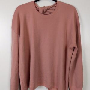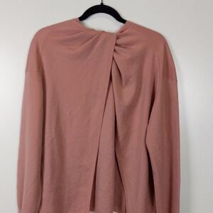 Theory "Twylina" sweater in Refine knit. Crew neckline; twist detail with flyaway back. Long sleeves; dropped shoulders. Relaxed, swing silhouette. Arched hem. Pullover style. Merino wool. Imported of Italian material.