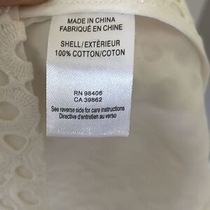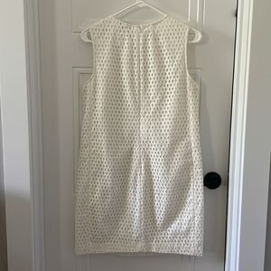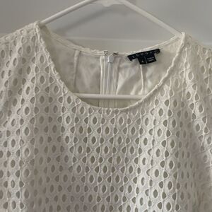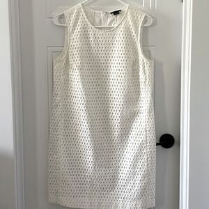 Beautiful preowned white shift dress with eyelit fabric over a white lining. It is sleeveless with a hidden back zipper, no pockets.