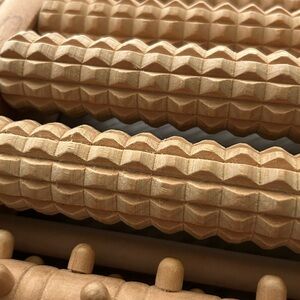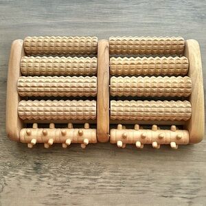 Relax with this wooden foot massager roller. Features multiple textured rollers for a soothing experience. Perfect for stress relief.