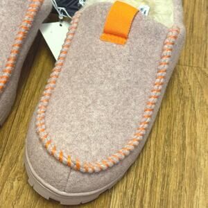 • Other information: Women’s memory foam slip-on slippers. Marbled pink color with orange stitching and cream insoles. Rubber soles. Machine washable.