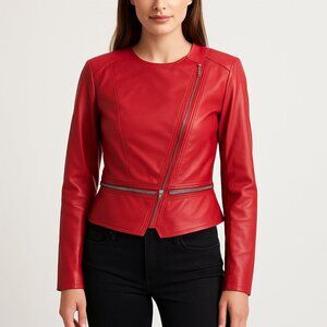 Turn heads in this bold and chic red faux-leather moto jacket!