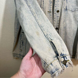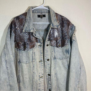 There is some stains on the front pocket by the button on the bottom and down the sleeve. I tried to include them all in the photos. There’s no holes very unique snake print Quence pattern. Western country girl. Women’s plus size 2X it is a little oversize kind of stretchy denim material. Measurements are in the photos.