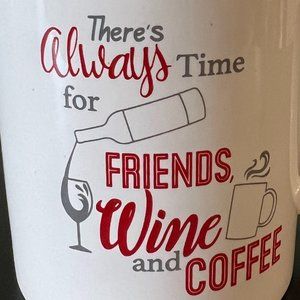 No more excuses. Brew the coffee. Uncork the wine. Both sides of this charming mug feature graphics of a wine bottle pouring wine into a stemmed glass and a steaming mug of coffee intertwined with fancy red and black lettering that reads: There's Always Time for Friends, Wine, and Coffee.