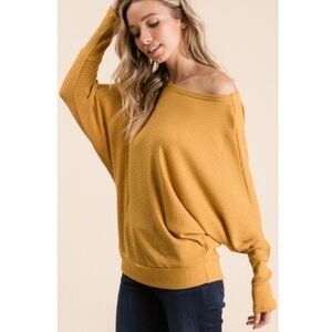 • DESCRIPTION: Mustard Yellow Off the Shoulder/Wide Neckline with Self Sleeved Cuff, Thermal Fabric that's soft and Stretchy