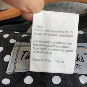 Cute and functional waterproof rain jacket by Mercantile Trading Company of Canada. Beige waterproof polyester outer with black & white polka dot cotton lining. Full hood with drawstring. Zip front. Turned cuff sleeves. Front pockets. Size medium. Very good preowned condition other than a few marks on the front and sleeve as pictured.