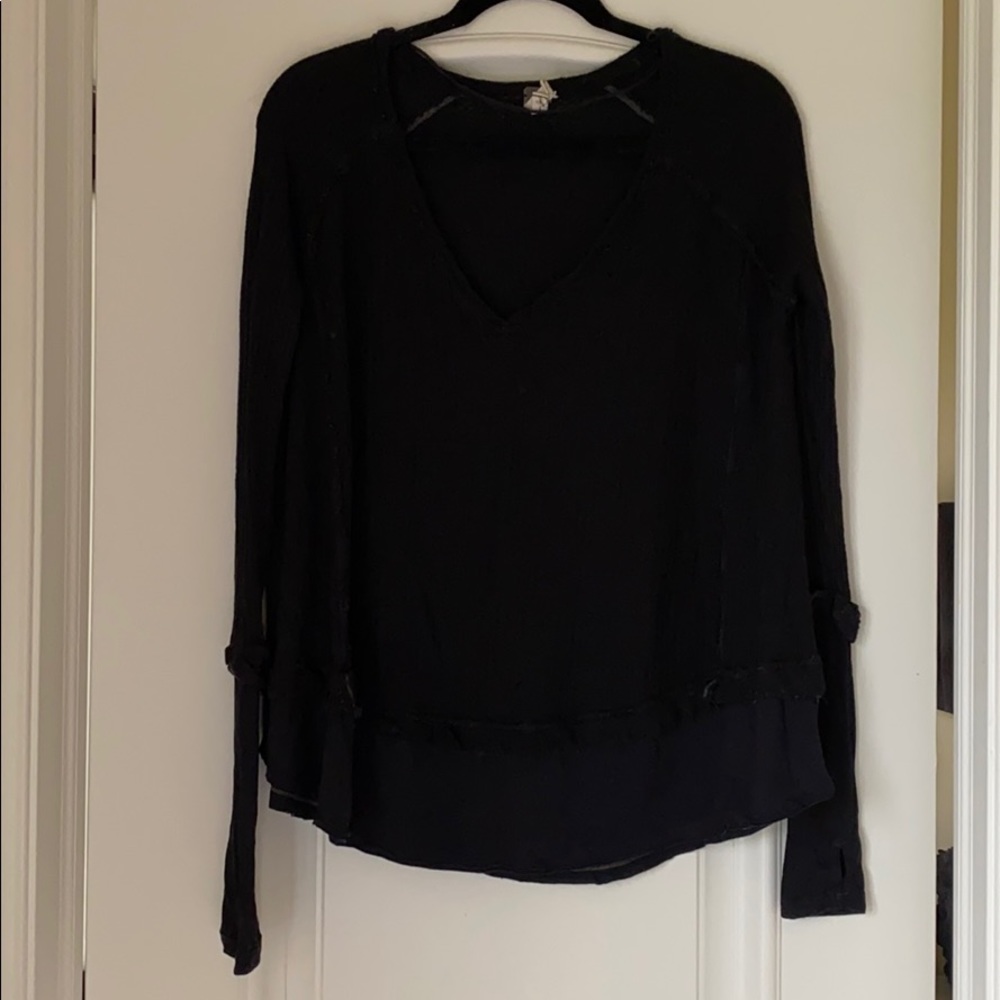 Deep vneck. Good for layering over bralette or cami. Thumbhole sleeves. Swingy fit. Lightweight thermal.