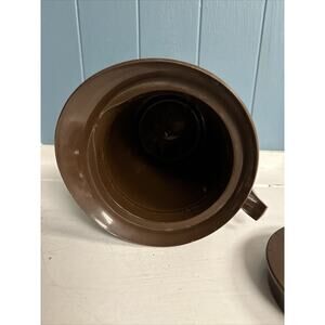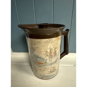 This vintage Thermo Serv insulated pitcher is a unique addition to any collection. With a capacity of 55 oz., it is perfect for keeping your drinks cold for hours. The pitcher features a lovely brown color with a printed finish and a lid to keep your drinks safe.