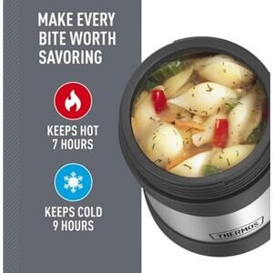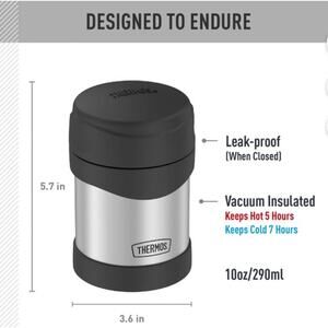 Pack a delicious lunch with this Thermos 10 oz Vacuum Insulated Stainless Steel Food Jar. This unbreakable container keeps foods hot for up to seven hours and cold foods cold for up to nine hours. With a stainless steel interior and exterior, this vacuum-insulated food jar ensures long-lasting performance. The exterior stays cool to the touch and does not sweat, which allows you to safely pack it with your other food items. It has an extra-wide mouth that makes it easy to fill, eat from and clean. It holds up to 10 oz of food and is well-suited to keep a variety of your favorite dishes. Use it to pack hot meals, such as soup, pasta, stew, stir fry and casseroles or cold meals like salads, vegetables, hummus and dips. This Thermos food jar is conveniently compact to make it easy for travel.