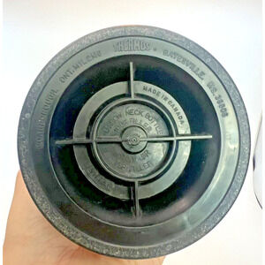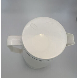 This Thermos container is a vintage 32 ounce insulated narrow neck bottle designed for keeping food and drinks hot or cold. It is made of ivory-colored plastic and stands 12 inches tall. The Thermos features a solid color design and is perfect for storing beverages on the go. Made in Canada, this Thermos container is a stylish and practical addition to any kitchen or dining collection.