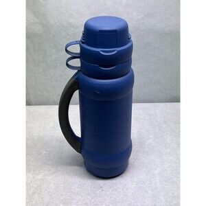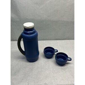 1 pre owned Vintage Blue 1 Liter 35oz Double Fill-a-cup Thermos #32-34-100 with 2 coffee mugs storage lid. Made in China. Excellent condition! Some light scuffs on exterior and minor signs of use. Still functions great!