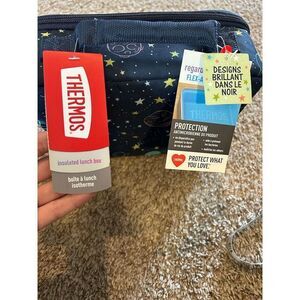 This Thermos insulated lunch box features a vibrant multicolor space-themed design with planets, rockets, and stars, perfect for kids. Made from durable, insulated material, it includes antimicrobial protection and an easy-to-clean surface. The lunch box is 100% PVC free and comes with a lid. It is new with tags.