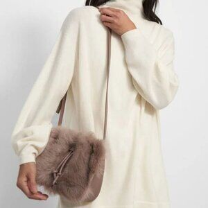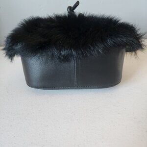"LIKE NEW" Gorgeous Black Shearling & Leather Micro Bucket Bag By Theroy. Made in Italy, Plush Long Haired Shearling & Smooth Black Leather, Cinch Closure with Tubular Leather Drawstring & Snap Top Closure, Adjustable Crossbody Strap,