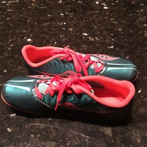 These shoes are bright have only been used for one track season. The have a few scratches around the toe part of the shoe, and the bottom.
