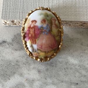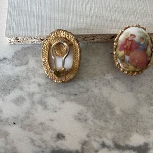 Purchased from an antique mall. Clip on. Gorgeous painting on these. Set in a pretty gold setting.
