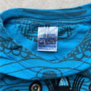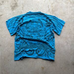 aztec print, vibrant blue, oversized fit, graphic tee, boho style, streetwear, festival wear, bold pattern, casual top, colorful design