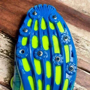 Step up your running game with the Thestron Track and Field Shoes Men's Nail Spikes. Designed for professional performance, these track shoes are engineered to be lightweight and breathable, ensuring maximum comfort and speed. Crafted with a vamp that contours to your foot, they provide an unparalleled fit. The sole features eight scientifically placed nails to enhance your running speed, although one spike on the left shoe is missing. Despite this, the shoes remain in like-new condition. Included in the package are extra spikes and tools, making these shoes perfect for school track exams, racing, and various running events.