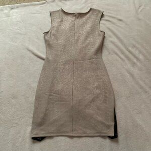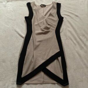 cuteLight champagne gold colour withblack outlining mini dress with crOne Sizesover design, super flattering fit, stretchy material brand: thevintage shop size M