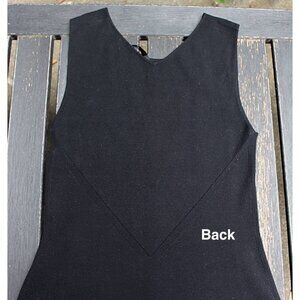 Features a rounded V-neckline, sleeveless and viscose 2x stretch construction. Overall this is seamless, but there is a decorative V open seam on the back, see photos.