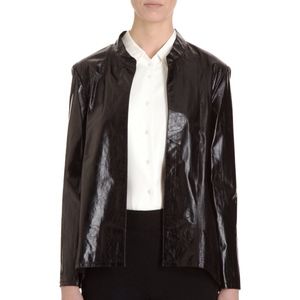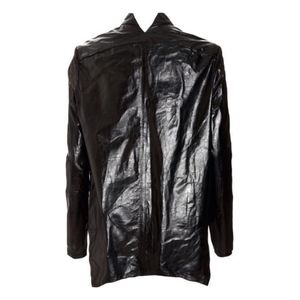 This glazed, wrinkled kangaroo leather jacket features a notched mandarin collar and an open placket. Side slits and asymmetrical hem. Long sleeves. Unlined.