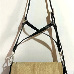 Theysken’s theory beige canvas black patent leather crossbody