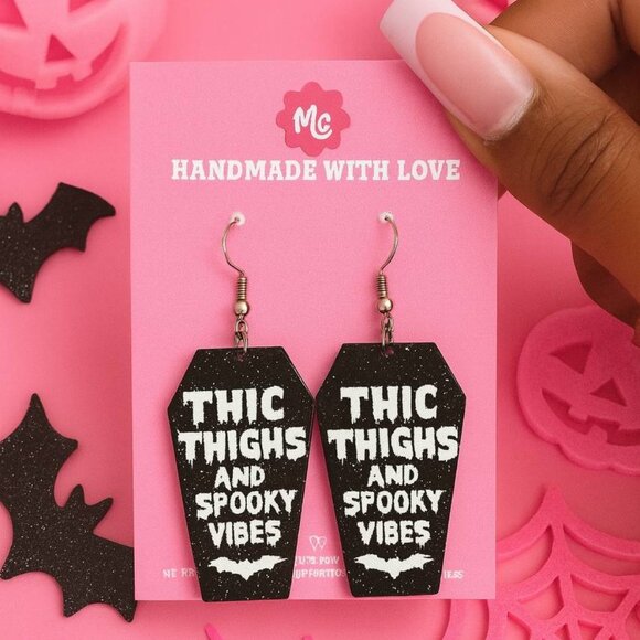 These adorable coffin earrings bring the perfect mix of spooky & cute vibes. Designed with a bold “Thic Thighs & Spooky Vibes” print, they’re the ideal accessory for Halloween lovers who want fun statement jewelry that stands out. Lightweight, comfortable, and perfect for parties, everyday outfits, or spooky-season photoshoots.