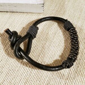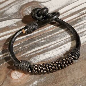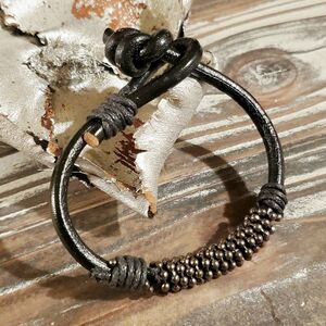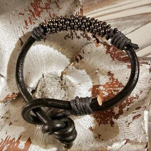 Handcrafted India Thick Black Goat Leather Vintage Gunmetal Beads BraceletHandmade in India from 4mm thick goat leatherVegetable dyed genuine leather with black waxed cotton wrap accentsWeathered vintage gunmetal gray Bali style dotted 8mm diameter rondelle beadsPrimitive tribal style knotted claspEach bracelet will vary slightly in appearance and sizeAverage inner circumference is 6.5" to 7"