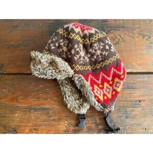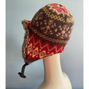 Thick Brown/Red Fleece Lined Winter Hat w/Ear Flaps size OS (Unisex). Featuring a brown/red/yellow thick knit, fleece lining, faux fur trim, ear flaps and an adjustable clasp closure. *(Note: Faux fur shows signs of daily wear but overall the hat is warm and in good condition).