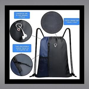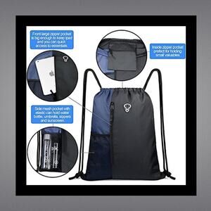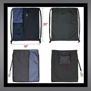 Drawstring black backpack gym bag with two zipper pockets and water bottle mesh pocket. This large drawstring backpack bag is perfect for men and women who like fitness and sports. This is a lightweight string backpack with main large compartment and zipper pockets that can hold all the items you need to get to in a hurry. This gym backpack can last a long time even in the harsh environment. No more stressing about getting your cinch bag dirty because these gym sack are machine washable, reusable and durable. Will ship fast and with care!