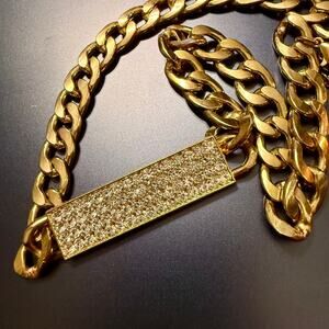 This is an exquisite thick gold tone choker chain necklace with a center piece rectangle of rhinestones (64 in total - all intact). It features a cable chain measuring 14 - 16" and is in excellent preloved condition. It is unsigned but a striking, quality piece.