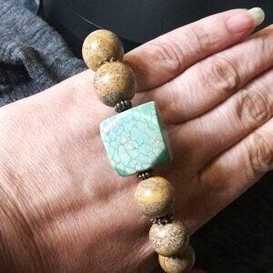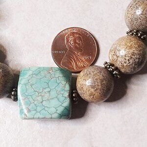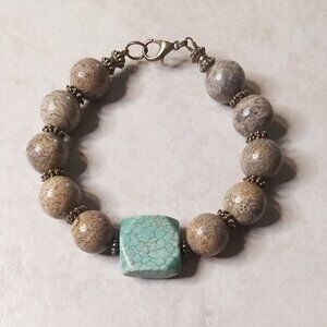 I made this with huge + heavy Picture Jasper Beads with a Square Turquoise Focal Stone. I used intricate bronze spacers to separate the individual beads; this bracelet securely closes with a very manageable lobster claw clasp. This is a BIG bracelet and will perfectly work with a neutral colored wardrobe; boho/bohemian clothing styles as well as go really nice with a country, western or southwestern vibe.