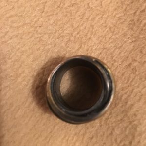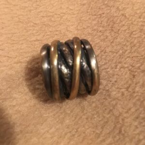 Super cool piece! Size 6 but because it’s so wide, fit is smaller. Looks like brass wires of varying shades wrapped together.