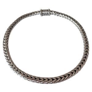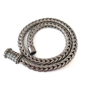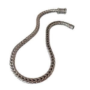 Silver tone with decorative magnetic clasp, has weight to it. 17.5” L, 1/4” W