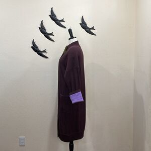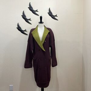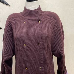 There is no size listed or care label. Material is a lovely soft knit with quality seams - possibly a wool blend based on feel; Medium weight; Double gold tone snaps down the front; Padded Drop Raglan shoulders (pads can be removed); Patch pockets; Lavender color knit accent at the cuffs - Green accent knit under snaps.