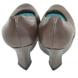 Offered is this stunning pair of designer Thierry Rabotin pumps in "Rose Brown" leather - overall color is rich taupe with a slight plum purple to rose undertone and teal liner. The heel is a fabulous triangle block. The heels are in very gently pre-owned condition and free from odors or blemishes.