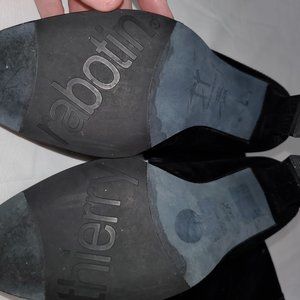 Black shimmer suede Thierry Rabotin round-toe mid-calf boots with tonal stitching throughout, covered heels and wrap-around tie closures at uppers. Pretty robin's egg blue leather lining. Really gorgeous boots in very good condition! Moderate scuffs at soles; light wear at insoles; slight blemishes throughout suede. Heels 3", calf circumference 12".