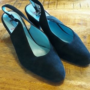 Black suede closed toe sling back heels. Signs of wear on heels. See photos. Made in Italy. Vero Cuoio. Size 37