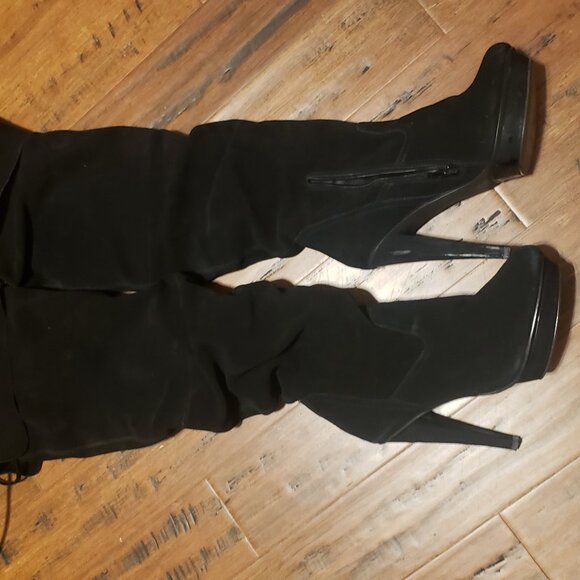 Black Suede Leather. Size 8. Spiked heel height is 5". Height is 26" from sole to cuff. Ties on back of thigh area. Great condition.