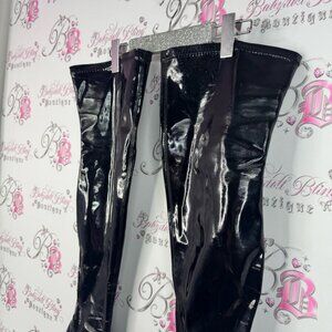 Step out in style with these sleek black patent leather thigh-high boots. Perfect for making a bold fashion statement. No size tags. They fit 7.