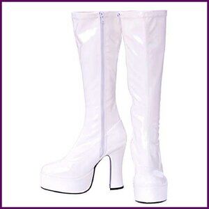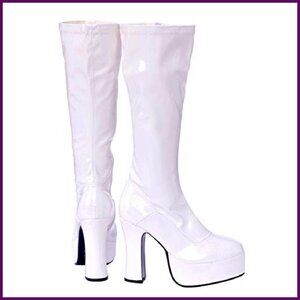• Style: Mid-calf platform high-heel boots with a shiny patent finish and side zipper closure.
