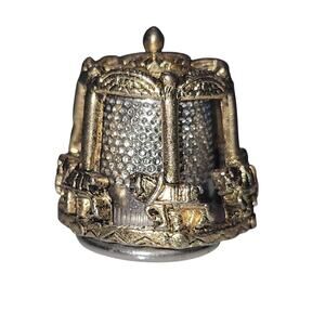 This vintage original thimble features a spinning horse carousel design, crafted and signed by Nicholas Gish. With a size 9, this thimble was made in Spain, adding to its unique and collectible appeal. The intricate details of the spinning horse carousel design make this thimble a charming addition to any collection, showcasing fine craftsmanship and artistry.