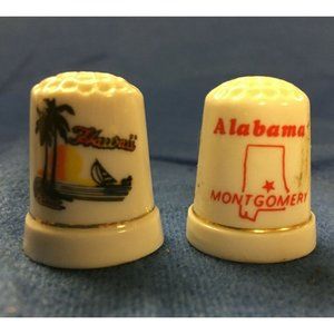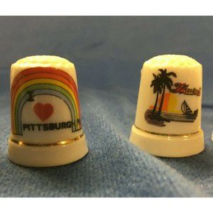 5 Porcelain Thimbles. Each with a different City/State. Sault Ste Marie, Pittsburgh, Hawaii, Montgomery Alabama, Indianapolis Indiana. Each thimble measures 1"x1"