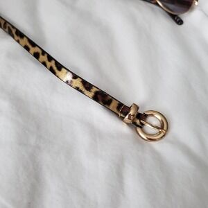 Thin, vinyl leopard print belt. Shiny, with a round, gold buckle