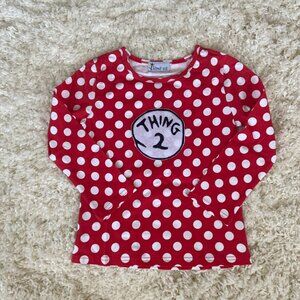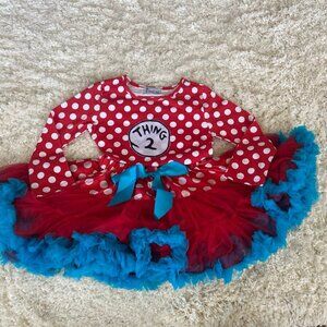 This is brand new never worn. This is soooo cute. It's made with polka dots on the skirt and headband. The skirt is a pettiskirt so it's a lot fuller than a tutu skirt. This is a long sleeve shirt Thing 2 on the shirt. Great for your little one's birthday. Perfect for Halloween events!