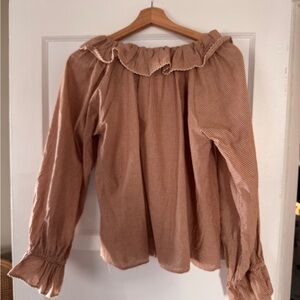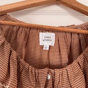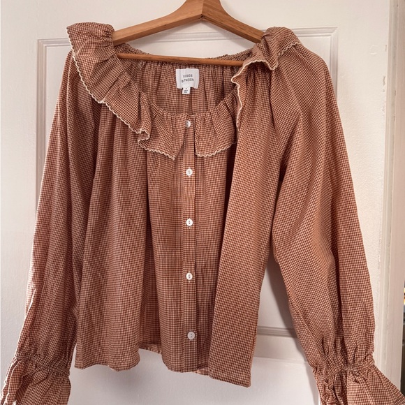 Chic gingham blouse with ruffle details. Button-down front. Stylish and versatile.
