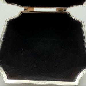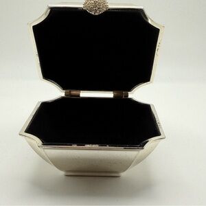 Things Remembered silver tone trinket box for rings, earrings, etc. Rhinestone heart detail. Black felt interior. Has a couple small dark specs. Please see photos.
