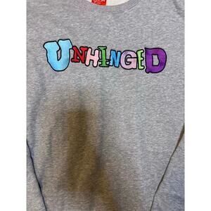 Cozy gray sweatshirt from Things by Garrett, featuring the colorful embroidered “UNHINGED” graphic on the front — a signature design from Garrett Watts’ limited merch line. Made from a soft cotton-poly blend with a fleece interior, this crewneck is perfect for lounging, layering, or making a statement.