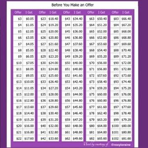 @nonajane that is an interesting analysis! Thank you. This is not my chart, however. I borrowed it from another user. You will find these charts, or variations, in hundreds of Posh closets. I viewed it just as a strong suggestion not to low-ball, and posted after several people offered me less than half on my already-low-priced Balenciaga bag. Frustrating and a waste of my time when the offer is so unreasonable. Happy poshing, and thank you for taking time to pist! 💕
